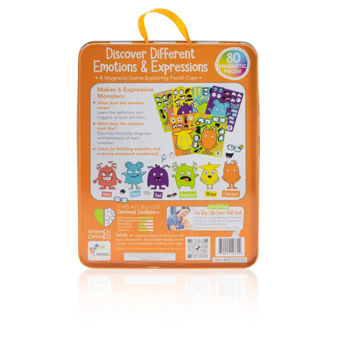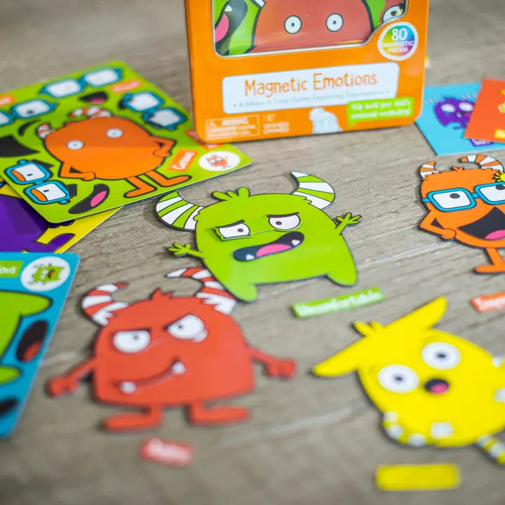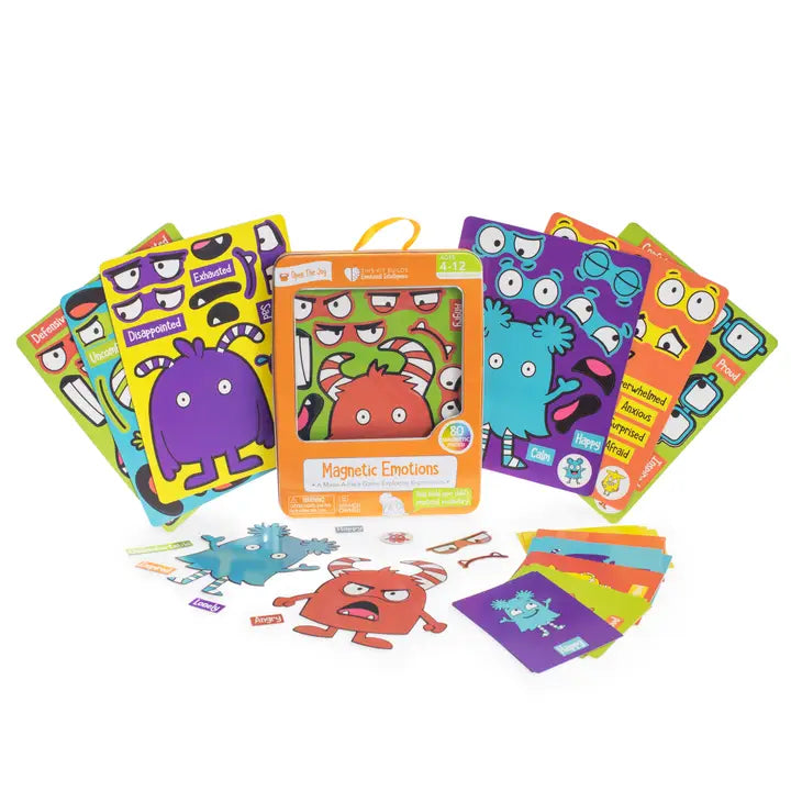 INCLUDES: 84 magnet pieces (6 colorful characters, 24 eyes, 24 mouths, 24 emotion words, and 6 icons), and 20 emotion cards in a tin case